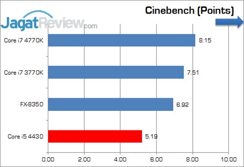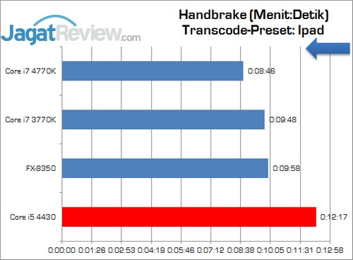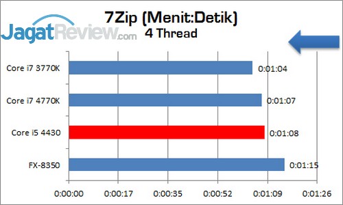 Pada benchmark yang sangat mengandalkan clock tinggi dan jumlah thread yang banyak, sekali lagi tertinggal bahwa Core i5 4430 jauh tertinggal. Terlihat bahwa prosesor ini tertinggal 35-28% dari pembanding lainnya.