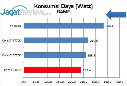 Baik dalam kondisi load maupun idle, Core i5 4430 menjadi prosesor paling hemat daya pada pengujian ini. Bahkan pada saat kami mencoba memberikan load pada prosesor ini menggunakan aplikasi LIN-X. daya yang dimakan hanya sebesar 92.7 watt.